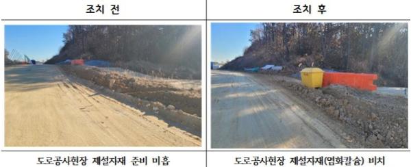 이번 점검을 통해 도로공사현장 사면 안정, 건축공사현장 가설구조물 지지력 보강 등 개선이 필요한 사항에 대해 ‘동절기 대비태세 보완 필요’, ‘위험성평가서 미수립 현장에 대한 위험성평가 이행 촉구’, ‘관련규정 미이행’ 등의 지적 사항이 188건 확인됐다. 이 가운데 152건은 즉시 조치 완료됐으며 나머지 36건은 조치 계획을 마련 중이다.