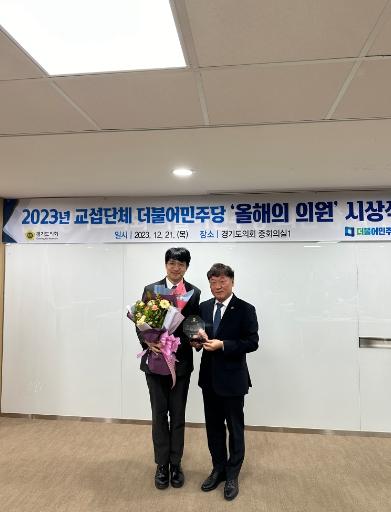 [한국뉴스타임=편집국] 경기도의회 여성가족평생교육위원회 장민수 의원(더불어민주당, 비례)이 21일 경기도의회 중회의실에서 열린 2023년 교섭단체 더불어민주당 올해의 의원상을 수상했다.