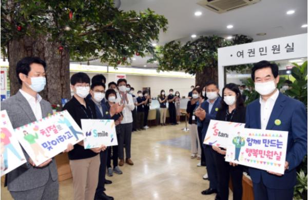 [KNT한국뉴스타임] 의정부시 안병용 시장은 7월 23일 시청 종합민원실에서 민원실 전 직원과 함께 ‘리마인드 친절 3S 캠페인’을 실시했다.