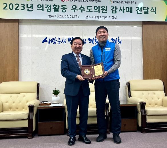 경기도 3개 노조(경기도청공무원노동조합?전국공무원노동조합 경기도청지부?경기도통합공무원노동조합)는 12월 21일 ‘2023년 의정활동 우수 경기도의원’으로 김성남 농정해양위원장을 선정, 감사패를 수여했다. 경기도 3개 노조는 리더십, 도덕성, 청렴성, 비전제시, 도민을 위한 소신 있는 정책 결정, 공정하고 투명하나 의정활동 추진 등을 갖춘 우수 도의원들을 선정하고 있으며, 특별히 올해는 경기도청 3개의 노조가 통합으로 진행했다.