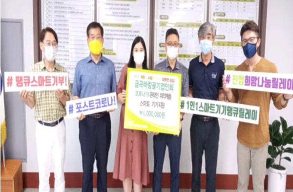 [KNT한국뉴스타임] 남양주시 진접읍 금곡바람골기업인회(회장 임병학)는 지난 22일 1인1스마트기기 땡큐릴레이 성금 600만원을 북부희망케어센터를 통해 진접오남행정복지센터에 기탁했다.