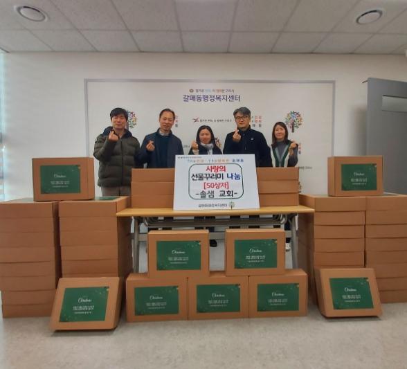[한국뉴스타임=편집국] 구리시 갈매동 행정복지센터는 지난 21일 갈매동 솔샘교회로부터 갈매동 취약계층을 위한 ‘사랑의 선물꾸러미’ 50박스를 전달받았다.