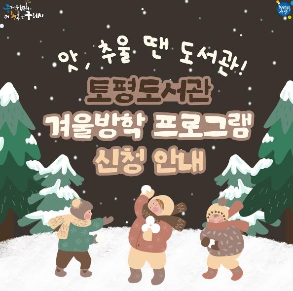 백경현 구리시장은 “어린이들이 도서관에서 다양한 문화 체험을 하며 행복을 충전하고, 꿈을 향해 한 걸음 더 나아가는 겨울방학을 보내길 바란다.”라고 전했다.
