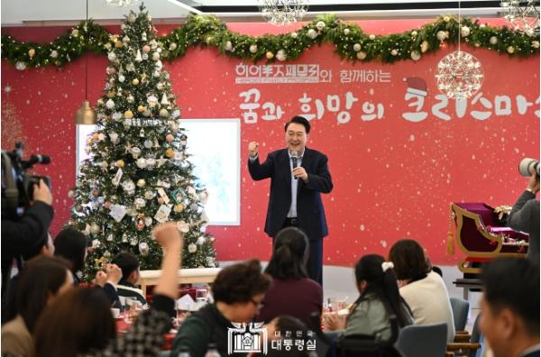 대통령은 대통령실에서 개최하는 첫 크리스마스 행사를 히어로즈 패밀리와 함께해 정말 뜻깊다는 소감을 밝히고, 참석자 모두가 꿈과 희망으로 가득한 새해를 맞이하기를 기원했다.