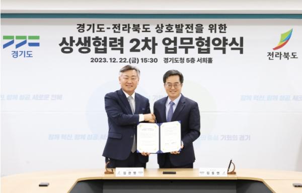 김동연 경기도지사와 김관영 전라북도지사는 22일 경기도청에서 이 같은 내용을 담은 ‘경기도-전라북도 상생번영을 위한 상생발전 2차 합의문’에 서명했다. 이번 협약은 지난 1월 17일에 이어 전라북도와 맺은 두 번째 상생협약으로 1차 8개 항목에 이어 5개 협약 항목이 추가됐다.