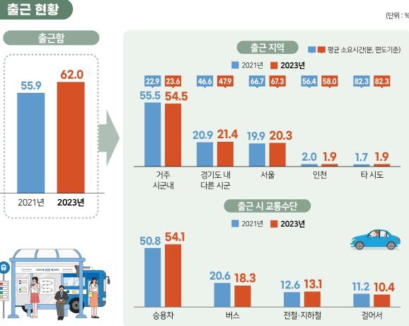 출근 시 주로 이용하는 교통수단은 승용차(54.1%)였으며, 대중교통 이용은 31.4%(버스 18.3%, 전철·지하철 13.1%)로 조사됐다.