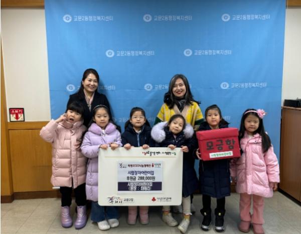 이번 후원금은 ‘어려운 이웃을 위한 연말 바자회’를 통해 시립장자어린이집 어린이들이 고사리 손으로 직접 기부해 마련한 후원금이며, 교문2동 지역사회보장협의체 CMS사업을 통해 저소득 가구 지원 등에 소중히 사용될 예정이다.