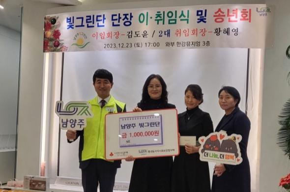 [한국뉴스타임=편집국] 남양주 빛그린단은 지난 23일 연말을 맞아 독거노인, 한부모가정 등 취약계층을 위해 단원들이 모금한 성금 100만원과 70만원 상당의 종합건강검진우대권을 평내동 지역사회보장협의체에 지정 기탁했다.