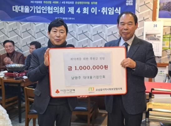 [한국뉴스타임=편집국] 남양주시 오남읍은 지난 22일 대대울기업인협의회가 오남읍 내 취약계층을 위한 후원금 100만원을 전달했다고 26일 밝혔다.