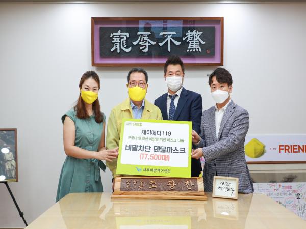 남양주시(시장 조광한)는 23일 제이메디119(대표자 백진우)에서 코로나19 확산 예방을 위한 비말차단용 덴탈마스트 17,500매를 기부했다고 전했다.