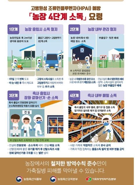 시 관계자는 “지역 내 조류인플루엔자 발생을 차단하기 위하여 가금농장 및 축산 관련 시설, 축산차량 등을 대상으로 「전국 일제 집중소독의 날」을 매주 수요일마다 실시한다”라며 “꼼꼼한 차단방역을 실시할 수 있도록 각 농장은 4단계 소독 요령을 숙지해 관내 고병원성 조류인플루엔자 차단에 협조할 것”을 강조했다.
