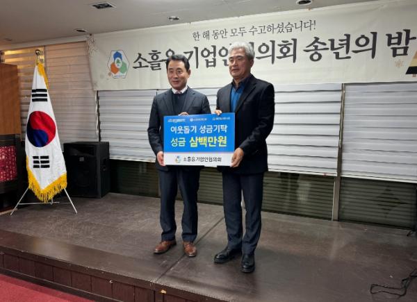 [한국뉴스타임=편집국] 소흘읍 기업인협의회는 소흘읍의 어려운 가정을 돕기 위해 회원들이 십시일반 모은 성금 300만 원을 소흘읍 행정복지센터에 기탁했다고 27일 밝혔다.