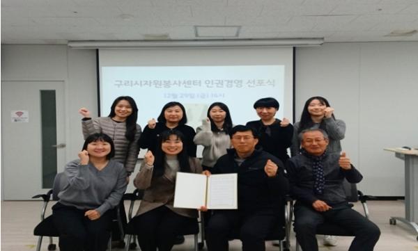 [한국뉴스타임=편집국] 사단법인 구리시자원봉사센터는 지난 12월 29일 선포식을 갖고 2024년 1월 1일부터 본격적으로 자원봉사 인권경영을 시행하여 인권경영의 정착과 확산을 위해 노력할 것을 다짐했다고 전했다.