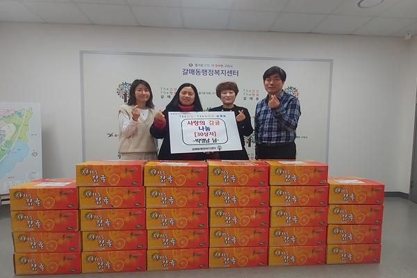[한국뉴스타임=편집국] 구리시 갈매동 행정복지센터는 지난 12월 28일 갈매동 주민 박영남 씨로부터 이웃돕기를 위한 사랑의 감귤 30상자를 전달받았다.