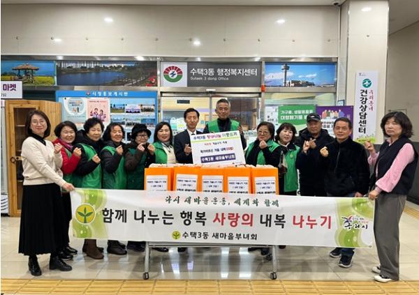 수택3동 새마을부녀회는 매년 연말이면 어르신들이 따뜻한 겨울을 보낼 수 있도록 내복을 후원하고 있으며, 이 밖에도 밑반찬 만들기, 삼계탕 행사, 송편 나눔, 김장 담그기 등 어려운 이웃을 위한 다양한 봉사와 후원 활동을 해오고 있다.