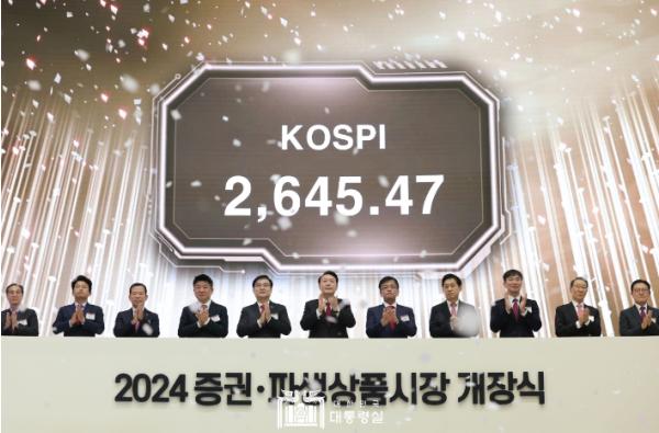 [한국뉴스타임=편집국] 윤석열 대통령은 1월 2일 오전 한국거래소 서울 사옥에서 개최된 ‘2024년도 증권·파생상품시장 개장식’에 참석했다.