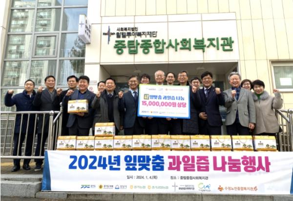 이들은 경기과일농협조공법인(경기지역 15개 농협이 출자한 법인)에서 기부한 1,500만원 상당의 경기도산 배즙 900상자를 지역 복지기관인 가나안근로복지관, 중탑종합사회복지관, 수정노인종합복지관에 나눠줬다.