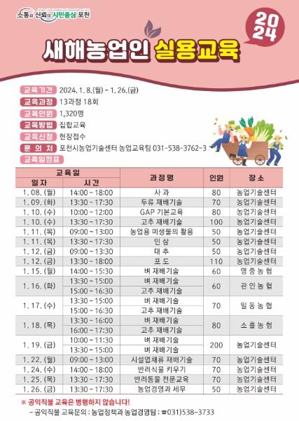 [한국뉴스타임=편집국] 포천시는 오는 26일까지 농업인들의 작목별 재배기술을 향상시키기 위한 ‘2024년 새해농업인 실용교육’을 추진한다.