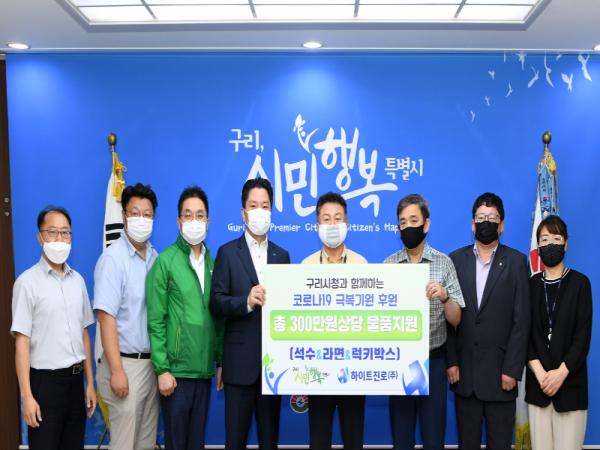 구리시(시장 안승남)는 23일 하이트진로(주)(경인권역 권역장 방상복)가 구리시청을 방문하여 코로나19로 힘든 시기를 겪고 있는 취약계층을 위해 생수 200박스, 라면 100박스 등을 전달했다고 밝혔다.