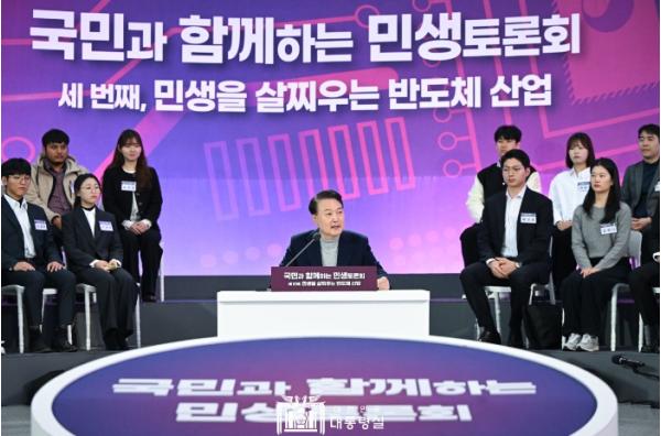 [한국뉴스타임=편집국] 윤석열 대통령은 1월 15일 오전 대표적인 반도체 인력양성 교육기관 중 하나인 경기도 수원시 소재 성균관대학교 자연과학캠퍼스 반도체관에서 ‘민생을 살찌우는 반도체 산업’을 주제로 세 번째 ?국민과 함께하는 민생토론회?를 개최했다. 이번 토론회는 경제정책 방향(1/4, 목), 주택(1/10, 수)에 이어 반도체 메가 클러스터 조성방안에 대해 기업과 지역주민, 학생 등 국민의 목소리를 생생하게 듣고 관계 부처가 칸막이 없이 한 자리에 모여 문제 해결 방안을 찾기 위해 마련됐다.