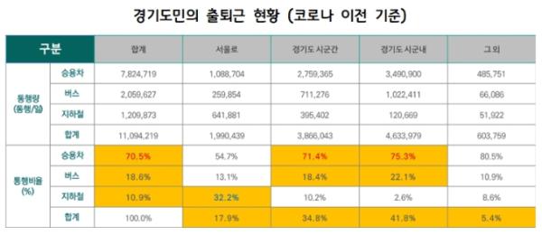 경기도~서울의 출퇴근은 하루 약 200만 통행이 발생(경기도 전체의 18%)하며, 그중 승용차를 이용한 출퇴근은 55%, 대중교통을 이용한 출퇴근은 약 45%를 차지하는 것으로 나타났다. 경기도 내의 출퇴근의 경우 승용차를 이용한 출퇴근이 시?군 간 71.4%, 시?군 내 75.3% 수준으로 나타나 승용차 의존도가 높은 것으로 분석됐다.