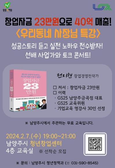 이번 교육은 남양주 시민으로 금곡동에서 편의점 사업을 성공시킨 사업가이자 경영필독서 ‘창업자금 23만원’의 저자인 전지현 대표가 자유로운 분위기 속에서 성공스토리와 실전 노하우를 공유하고, 지역의 후배인 청년들과 소통하는 토크콘서트 형식으로 진행될 예정이다.