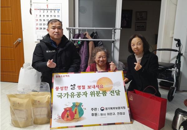 [한국뉴스타임=편집국] 경기북부보훈지청은 1월 15일 이문규 원사(2기갑여단 121기보대대), 전종삼 원사(제9사단 30여단)와 함께 설맞이 후원 물품으로 누룽지 세트를 파주 지역 재가복지 대상자 28가구에 전달했다고 밝혔다.