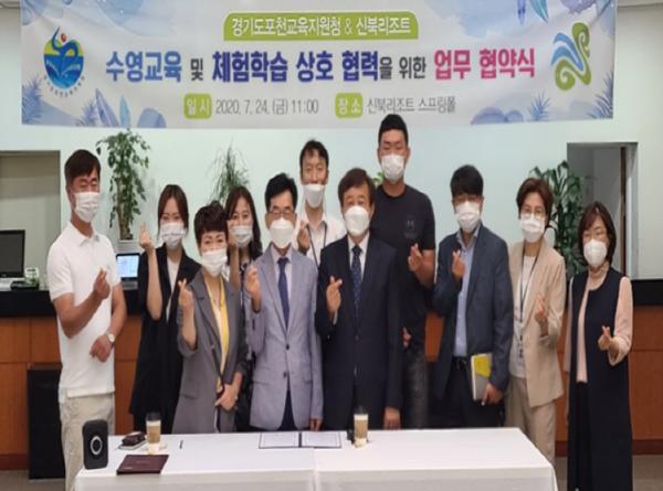 포천교육지원청(교육장 심춘보)이 24일 ㈜신북리조트(대표이사 김경혜)와 수영 교육 및 8대 분야 체험학습 기반 확충을 위한 업무 협약식을 가졌다.