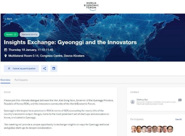 김 지사는 현지 시각 17일 밤 11시 30분(한국 시각 오전 7시 30분) 누리소통망 생방송을 통해 “재밌는 일이 벌어졌다. 세계경제포럼에서 저를 초청하는 유니콘기업(거대신생기업) 세션을 만들었다”라며 세션 개최 소식을 전한 바 있다.