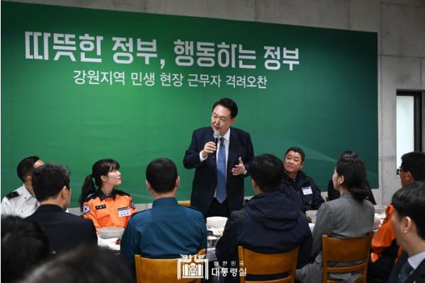 [한국뉴스타임=편집국] 윤석열 대통령은 1월 19일 오후 강원특별자치도 강릉시를 찾아 경찰·소방·사회복지 공무원 및 환경관리원 등 현장 근무자 40여 명과 오찬을 함께했다.