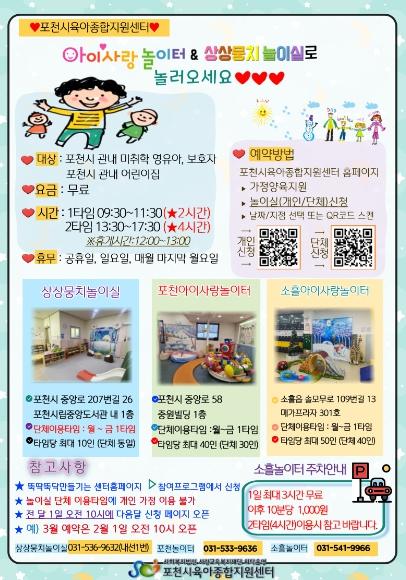 포천시육아종합지원센터는 현재 1호점 상상뭉치놀이터, 2호점 포천아이 사랑놀이터, 3호점 소흘 아이사랑놀이터 등 3개소의 아이사랑놀이터를 운영하고 있다.