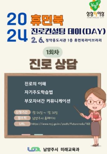 [한국뉴스타임=편집국] 남양주시는 진로 교육, 입시 및 진학, 자기주도학습 등에 관심 있는 시민을 대상으로‘휴먼북 진로컨설팅 DAY’를 운영한다고 22일 밝혔다.