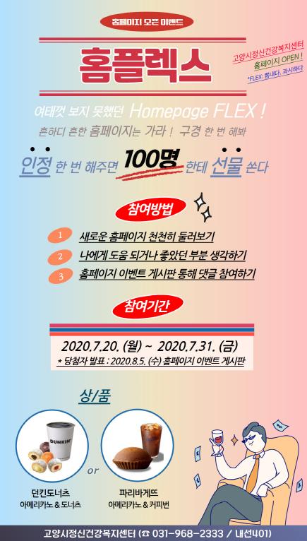 홈플렉스(Homepage Flex : 새 홈페이지를 자신 있게 내놓다) 이벤트 참여 방법은 고양시정신건강복지센터(https://www.goyangmaum.org/) 이벤트 게시물에 ‘홈페이지 사용 소감’을 댓글로 남기면 댓글 참여자 가운데 총 100명을 추첨해 소정의 경품을 제공한다.