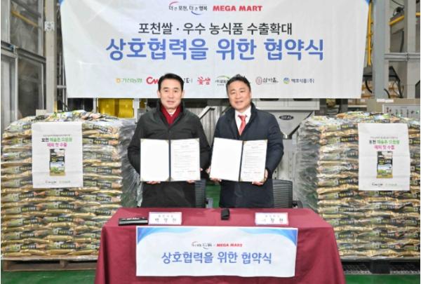 포천시는 23일 메가마트와 ‘포천시 우수 농식품 특별 판촉전’을 함께 추진하기로 협약을 체결하고 가산농협 미곡종합처리장에서 포천쌀의 미국 첫 수출을 기념한 수출 선적식을 개최했다.