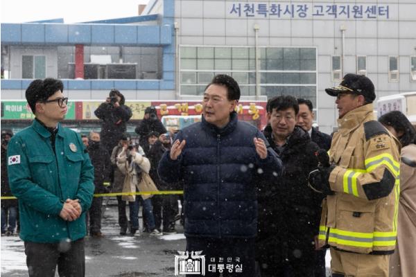 [한국뉴스타임=편집국] 윤석열 대통령은 1월 23일 오후 충남 서천군 특화시장 화재 현장을 방문해 설 대목을 앞두고 피해를 입은 시장 상인들을 위로하고 화재 진압을 위해 고생한 소방관들을 격려했다.