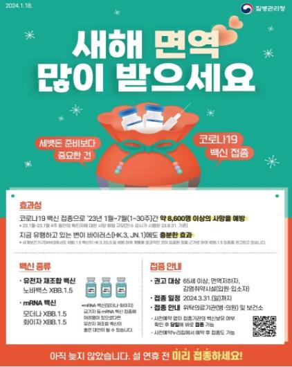 윤병근 방역관리과장은 “설을 앞두고 유동 인구가 증가함에 따라 코로나19 확산 예방이 필수적”이라며 “65세 이상 고령층과 감염 취약 시설 등 고위험군은 예방 접종에 적극 동참해 주길 바란다”라고 말했다.