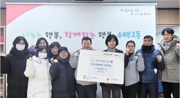 [한국뉴스타임=편집국] 구리시 수택2동 행정복지센터는 지난 24일 수택자율방범대로부터 온누리상품권(50만 원)을 전달받았다.