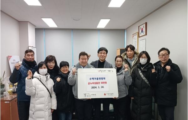 [한국뉴스타임=편집국] 구리시 수택1동 행정복지센터는 지난 24일 수택자율방범대로부터 온누리상품권(50만 원)을 기탁받았다.