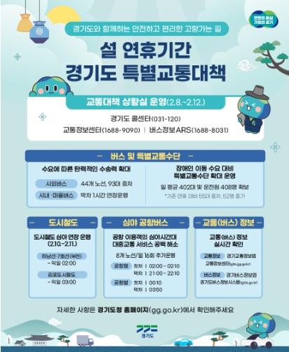 [한국뉴스타임=편집국] 경기도가 오는 2월 8일부터 12일까지 5일간을 ‘2024년도 설 연휴 특별교통대책기간’으로 정하고 귀향길 특별교통대책을 추진한다.