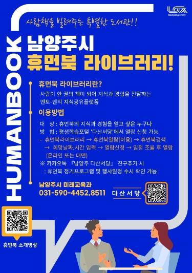 휴먼북 라이브러리는 다양한 분야의 경험과 전문성을 가진 사람(휴먼북)이 한 권의 책이 되어 이를 필요로 하는 아동?청소년?시민 등 독자(멘티)와 생생한 지식과 경험을 나누는 멘토-멘티 지식 공유 플랫폼이다. 현재 스포츠, 예술, 교육, 진로 등 10개 분야 317명이 재능기부를 하고자 휴먼북으로 등록되어 있다.