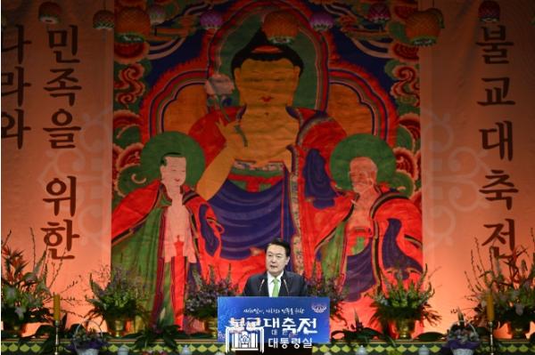 대통령은 (사)한국불교종단협의회 회장 진우스님과 함께 헌등을 하고, 이어지는 축사를 통해 불교 대축전 개최를 축하하며, 지난 여름 잼버리에서 불교계가 보여준 협력과 지원에 감사의 뜻을 전달했다.
