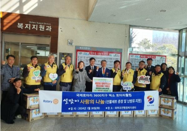 [한국뉴스타임=편집국] 남양주시 와부조안행정복지센터는 지난 30일 국제로타리 3600지구 덕소로타리클럽에서 저소득 취약계층을 위해 150만 원 상당의 명절 선물세트 및 난방유 지원금 300만 원을 전달했다고 밝혔다.