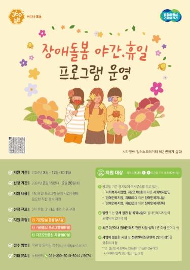 [한국뉴스타임=편집국] 경기도가 올해부터 선보이는 대표 복지정책인 ‘경기 360° 돌봄’의 하나로 야간?휴일에도 장애인이나 그 가족을 대상으로 돌봄프로그램을 제공하는 사업 운영기관 31개 내외를 공모·지원한다.
