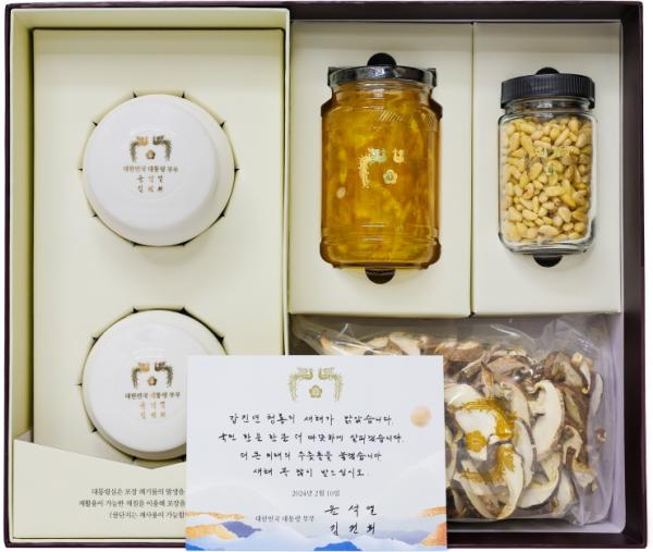 갑진년 설 선물은 전통주 산업을 활성화하고 지역 특산물의 소비를 촉진하기 위해서 차례용 백일주(공주), 유자청(고흥), 잣(가평), 소고기 육포(횡성) 등으로 구성됐다. 이번 선물은 포장 폐기물을 줄이기 위해 플라스틱을 최소화하고 재활용이 가능한 포장재와 보호재를 사용해 포장을 간소화했다.