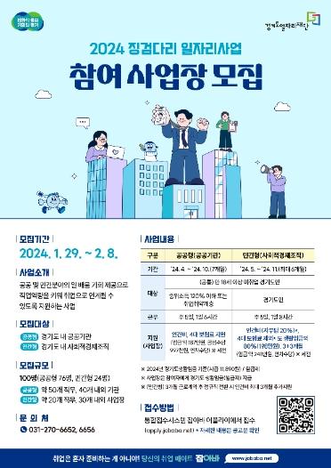 [한국뉴스타임=편집국] 경기도와 경기도일자리재단이 경력형성형 일자리 창출 지원사업인 ‘2024년 징검다리 일자리사업’에 참여할 사업장을 모집한다. 올해 모집 규모는 도 내 공공기관(공공형) 및 사회적경제조직(민간형) 70개 사업장이다.