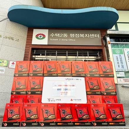 [한국뉴스타임=편집국] 구리시 수택2동 행정복지센터는 지난 31일 럭키24시마트로부터 신라면(20입) 50박스를 후원받았다.