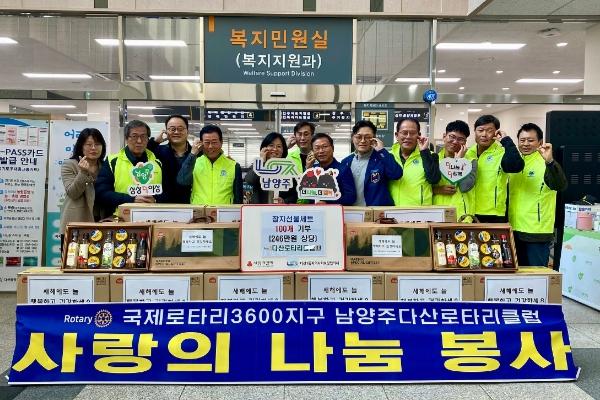 [한국뉴스타임=편집국] 남양주시 다산로타리클럽은 다가오는 설을 맞이해 1일 관내 취약계층을 위해 246만 원 상당의 참치 선물세트 100박스를 전달했다.