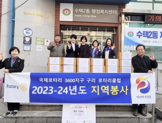 표영실 수택2동장은 “추운 날씨에 취약계층이 따뜻하게 명절을 보낼 수 있도록 지원해 주신 로타리클럽 모든 회원분께 감사의 말씀을 전한다. 후원품은 도움이 필요한 분들께 잘 전달하겠다.”라고 전했다.