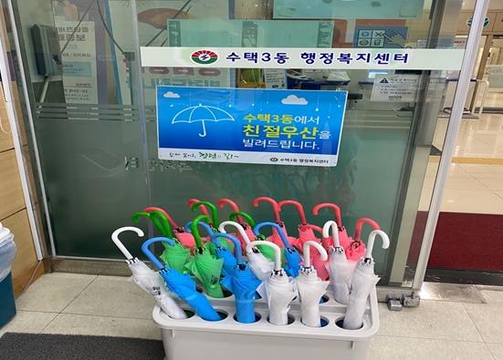 [한국뉴스타임=편집국] 구리시 수택3동 행정복지센터에서는 지난1월 31일부터 행정복지센터를 방문한 민원인들에게 ‘친절우산 대여서비스’를 제공하고 있다.