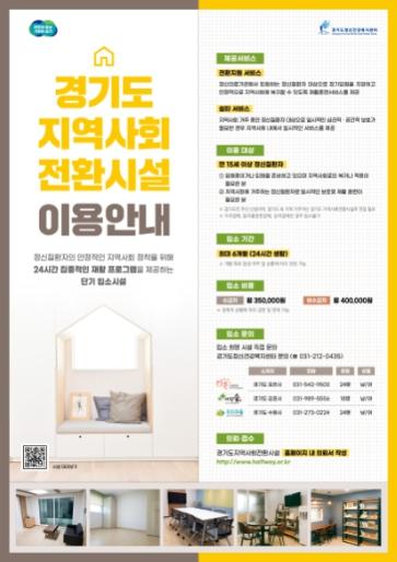 도는 2018년부터 수원, 김포, 포천에서 각각 지역사회전환시설을 운영하고 있다. 이곳에서는 정신의료기관에서 퇴원하거나 지역사회에서 생활하는 데 어려움을 겪는 정신질환자에게 24시간 보호와 재활 프로그램을 최대 6개월 제공한다. 3개 시설 정원은 총 66명이다.